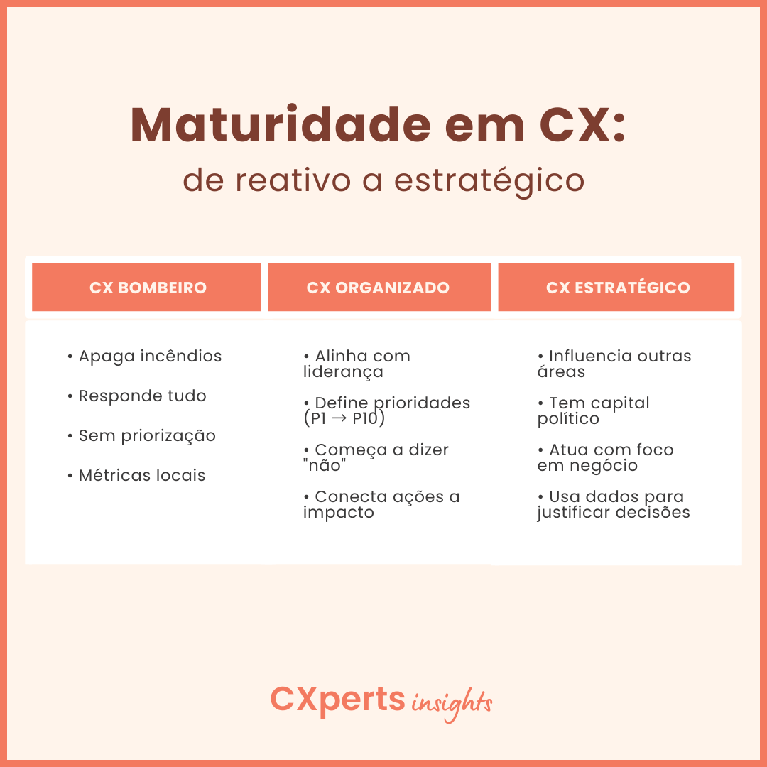 Renato define isso como o modo “bombeiro” da área. Aquele momento em que o time vira especialista em apagar incêndio, mas não consegue gerar valor estratégico. Quando isso se prolonga, CX deixa de ser diferencial e passa a ser mais um time operacional (eficiente, talvez, mas totalmente reativo).