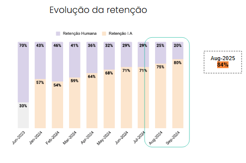 Hoje, a operação roda com 84% de retenção de todo o suporte pela IA, um CSAT médio de 64% nas interações automatizadas (sim, 64% de satisfação!) e um tempo de resposta de 16 segundos. Isso mesmo: 16 segundos.