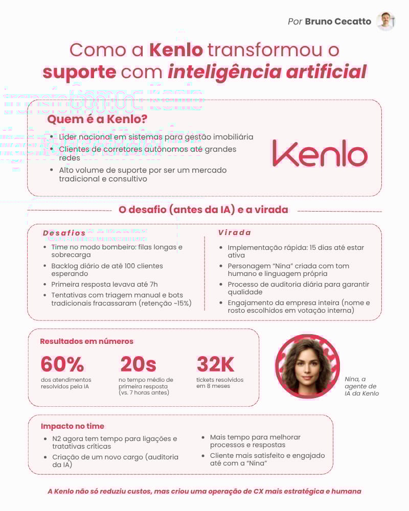 A Kenlo é um desses casos que todo líder de CX sonha em contar, porque mostra o que acontece quando a IA deixa de ser projeto e vira colega de trabalho.
